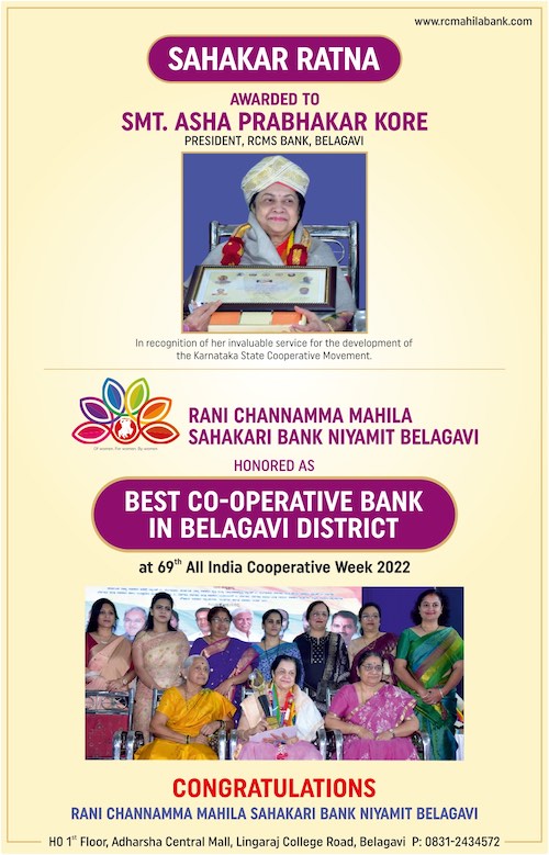- SAHAKAR RATNA awarded to Smt. Asha Prabhakar Kore for her invaluable service for the development of the Karnataka State Cooperative movement in 2022.